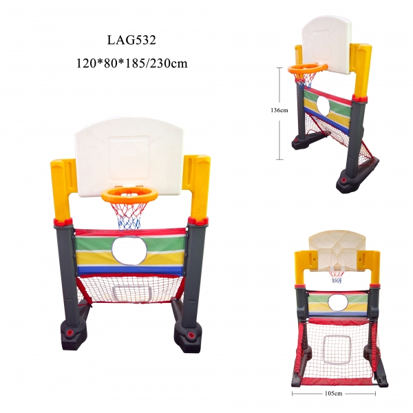 Универсальный спортивный комплекс Lerado - это комплекс, совмещающий в себе две игры: баскетбол и футбол. В нижней части комплекса располагаются футбольные ворота с сеткой, а в верхней баскетбольное кольцо. Такой комплекс очень удобно использовать на детских игровых площадках, так как наигравшись в одну игру, у ребенка здесь же есть возможность поиграть в другую. Позволяет создать настоящую спортивную площадку в условиях недостатка места. Высота расположения кольца может регулироваться, что дает возможность настраивать комплект для детей разного возраста. При этом все детали изготовлены из морозостойкого пластика, а использованные красители устойчивы к осадкам, температурным перепадам, ультрафиолету и механическим воздействиям. Благодаря этому вы можете установить комплекс как в помещении, так и на улице.