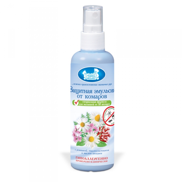 Детская защитная эмульсия от комаров (спрей) 120 г "Наша мама" разработана на базе репеллента нового поколения и предназначена для защиты кожи малыша от укусов кровососущих насекомых.