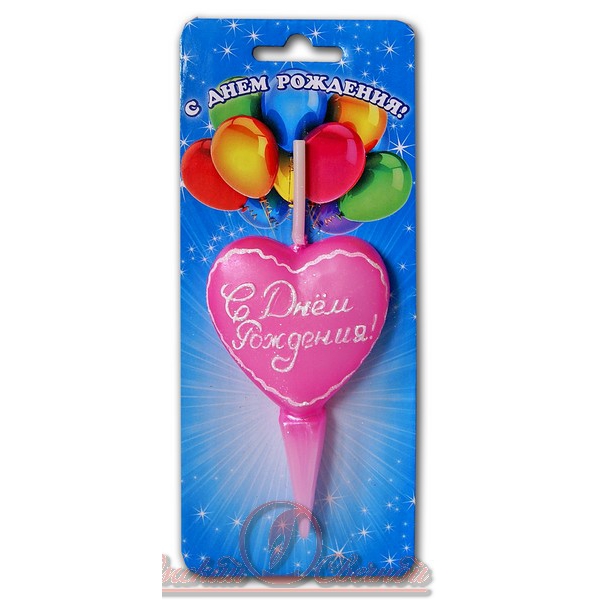 Свечка для торта, украшеная сердечком с надписью "С Днем Рождения!". Вес 14 гр. Высота 100 мм. Ширина 50 мм. Длина 50 мм. Примерное время горения 50 минут. ПРоизводство Россия.