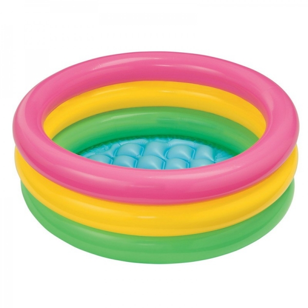 Детский надувной бассейн Intex Мини разноцветный, яркий, имеет три надувных кольца. Так как он рассчитан на детей в возрасте 1-3 года, пол в нем очень мягкий, с бугристой поверхностью против скольжения. Все что нужно – это наполнить бассейн водой и посадить в него вашего малыша.