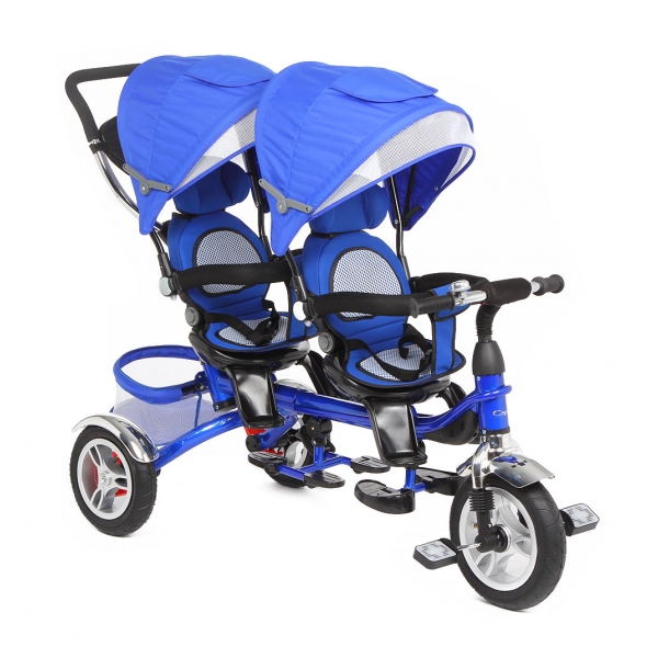 Это трехколесный велосипед для двойни. Модель оснащена родительской ручкой, которая позволит управлять направлением движения. Для удобства самых маленьких предусмотрена две подножки, а от солнца деток защитят два тента.