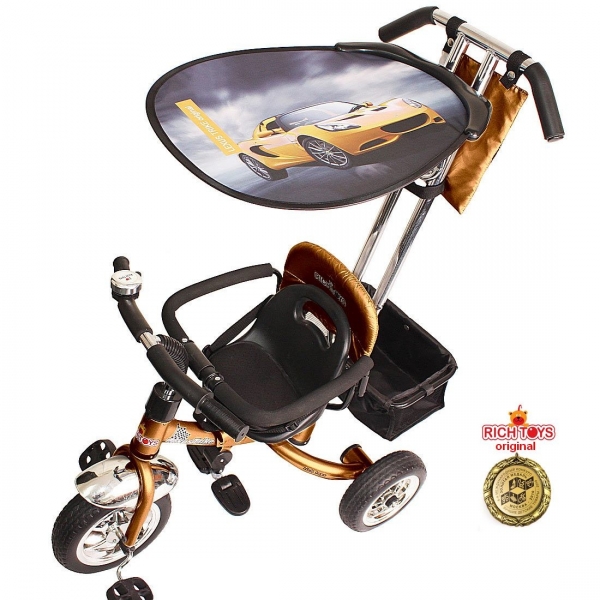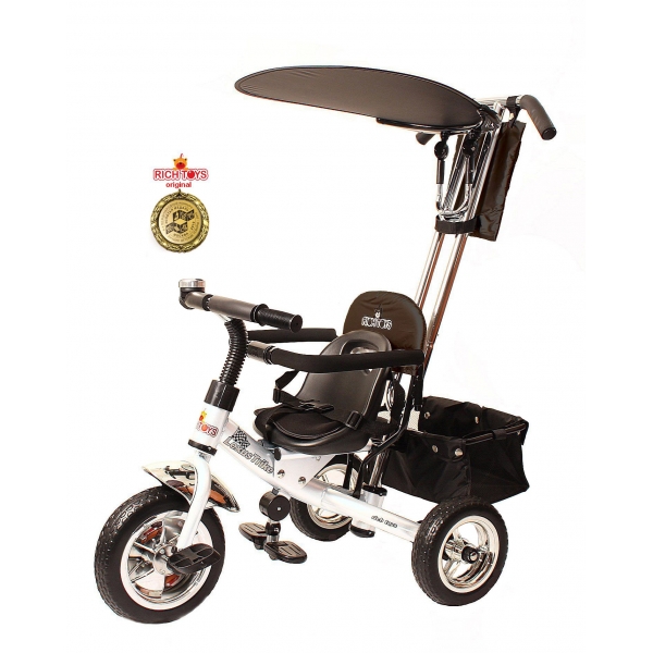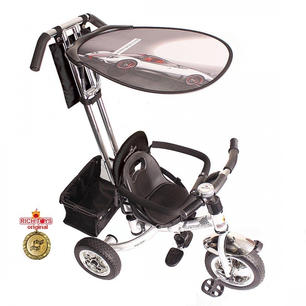 Новый стильный дизайн,хромированная облегченная рама,управляемая ручка-поворачивает велосипед направо и налево,блокиратор руля, диски цвета хром,большие колеса ПВХ,легко убираемые складные подножки,мягкое сиденье с точечными ремнями безопасности, звонок,складной тент, сумочка для мелочей,багажная корзина.