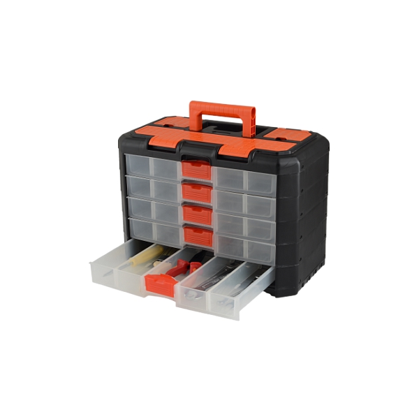 Универсальный сет для мелочей с ручкой для переноски. Секции фиксируются замками, которые надежно защищают от случайного открывания. Внутри секции разделены съемными перегородками, что позволяет организовать внутреннее пространство в зависимости от потребностей и делает сет пригодным для хранения не только мелочей, но и предметов средней величины. Встроенные секции на крышке подходят для хранения скобяных изделий.