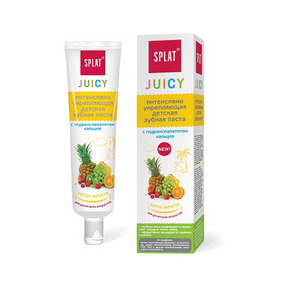 Паста SPLAT Juicy глубоко восстанавливает и укрепляет твердые ткани зубов, эффективно защищает от кариеса и налета.
