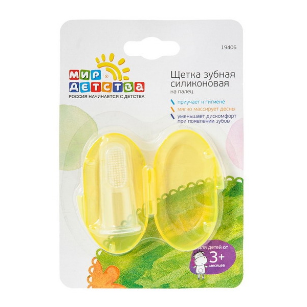 Массирование десен и чистка зубов осуществляется с помощью щетки, надетой на палец. Такую щетку удобно использовать для массирования десен при появлении зубов у малыша. Щетка удобна и компактна, снабжена футляром для хранения и может использоваться как в домашних условиях, так и в поездке.